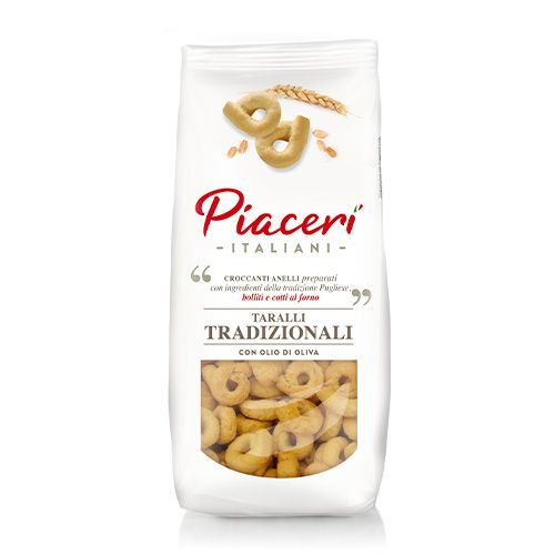 Made in the heart of Apulia based on experience acquired over more than 100 years, our Piaceri Italiani Taralli are produced with selected durum wheat semolina and high-quality raw ingredients.